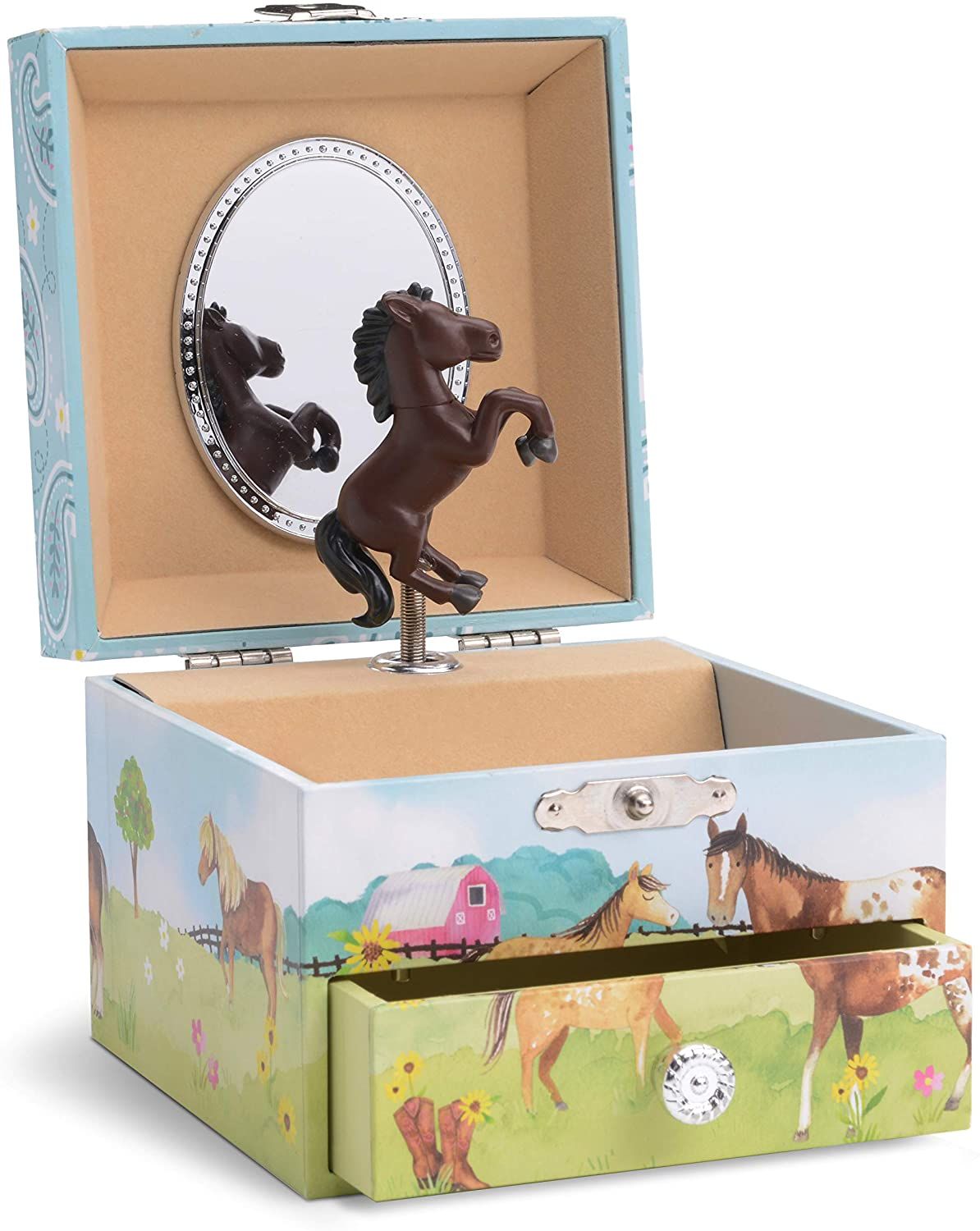 Any equine-obsessed kid (like my youngest) will delight in this horse jewelry box. The box is constructed with durable pine fiberboard and has plenty of space to store all of the treasures, including a small drawer. Charmingly, the horse dances as “Home on the Range” plays when they open the box!