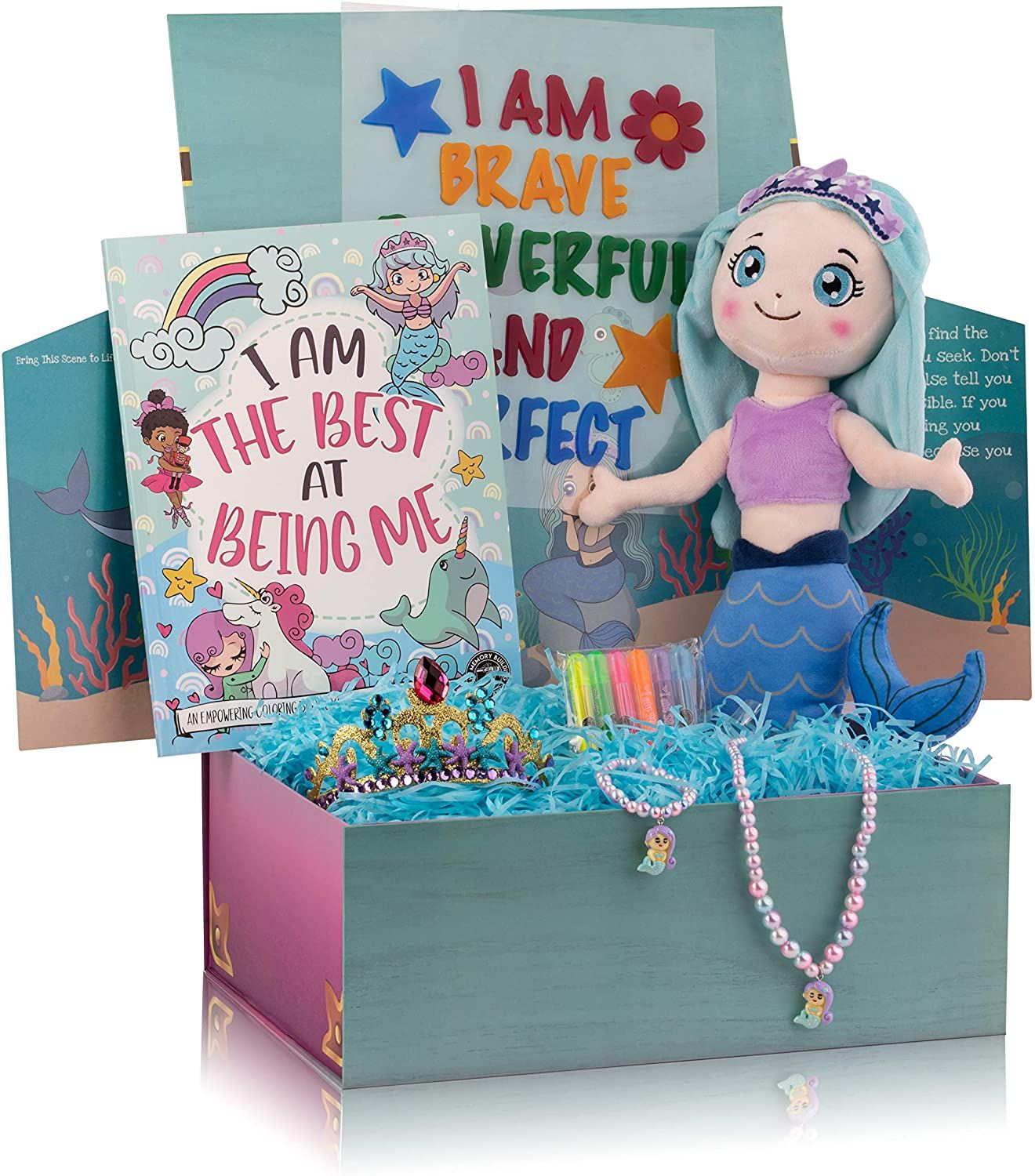 Know any littles who are super into mermaids? Have I found the perfect gift for you! This mermaid gift box has a ton of stuff, from a jewelry set to a coloring book to markers to a doll to a jewel-encrusted crown, and it all comes in a sturdy box to store their treasures!
