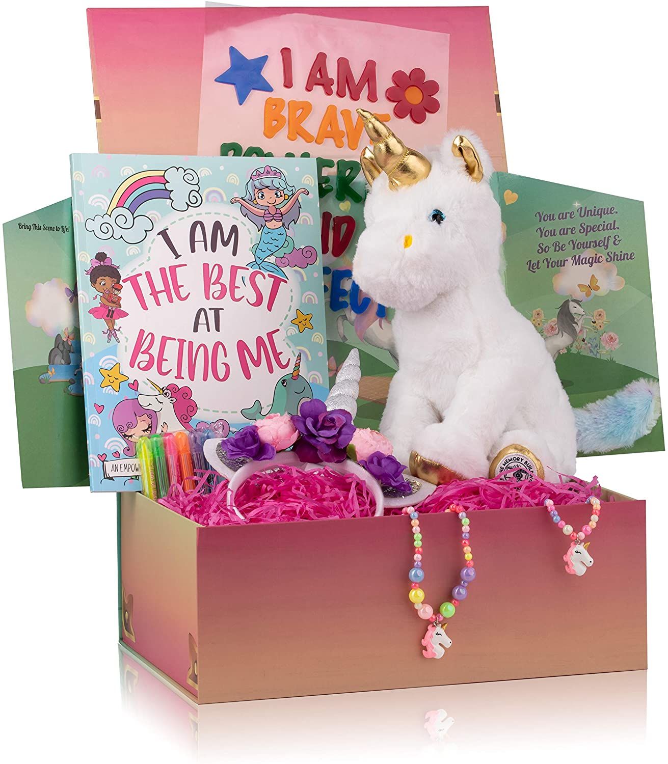 Little ones who can’t get enough unicorn-themed presents will adore this unicorn gift box. It includes a unicorn stuffy, a coloring book and markers, a flower-adorned unicorn headband, and of course, unicorn jewelry! I love the positive, powerful, and important messaging on the inside of the box, too.