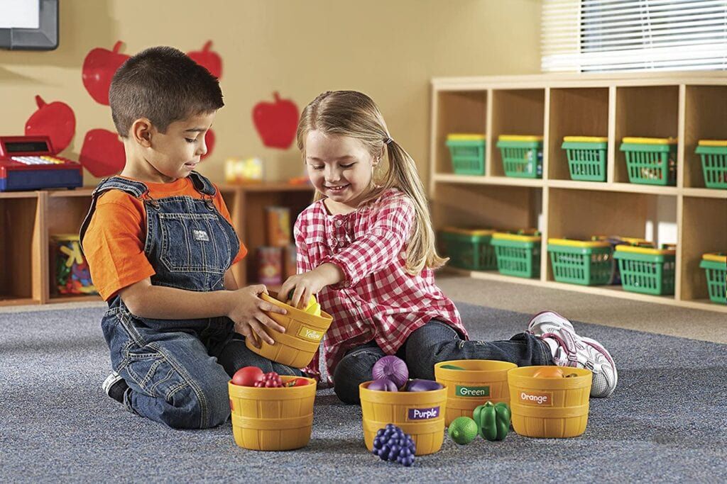 I’m a firm believer that toys should also be educational. And these sorting fruits are just that. Kids will love playing in an imaginary kitchen while also being able to sort their fruits by color.