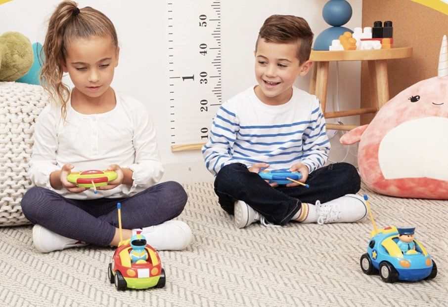 To give your kids a realistic RC car experience, use these. The two cartoon remote control cars offer forward and backward motions and even play realistic siren sounds and honking noises. Plus it has working flashing headlights.