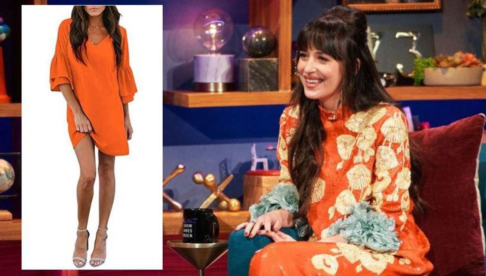 It’s the perfect time of year to recreate Dakota Johnson’s look with this bright orange shift dress.