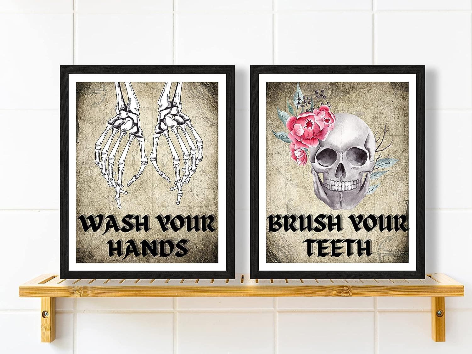 Summon a touch of skeleton humor to your bathroom with this set of three unframed prints. Perfect for your gothic-themed bathroom, these prints fuse spooky decor with hilarious bathroom references, creating an ambiance that’s a blend of eerie and entertaining. It’s the ultimate way to add a splash of humor to your daily routine, reminding you to brush, wash and flush with a grin. Crafted in the U S of A, they’ll arrive in stay-flat mailers – because even skulls deserve VIP treatment.