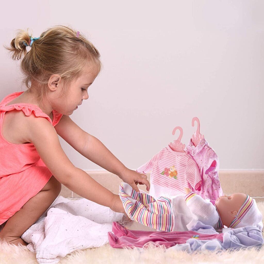 This 12-piece baby doll with clothes set comes with a 14-inch baby Dalia doll, four lovely outfit sets, and three hangers. The outfits are made of high-quality materials so that they will last long. It is also easy to clean so your toddler or daughter can play all day without worrying about making a mess.
