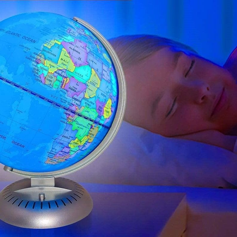 This illuminated world globe lights lamp is perfect for children of all ages and features an eight-inch globe of the world with built-in LED lighting and easy-to-read labels for continents and countries. Your child will love learning about the world around them while falling asleep under this soft and calming light.