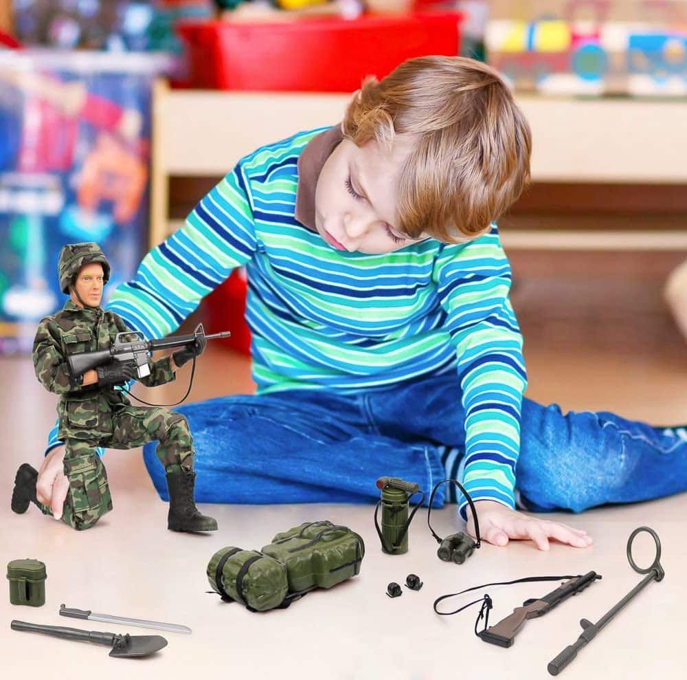 This bundle comes with a 12-inch military action figure, a locker storage box playset, and accessories. Each figure is individually packaged in its plastic bag, which is included in the packaging of the bundle. They are made from durable vinyl material that can withstand rough handling by kids. The item has many features, including an assortment of weapons and equipment, combat boots with laces to tie them on securely, and reinforced knees for more realistic positioning when playing or posing the figures on display.