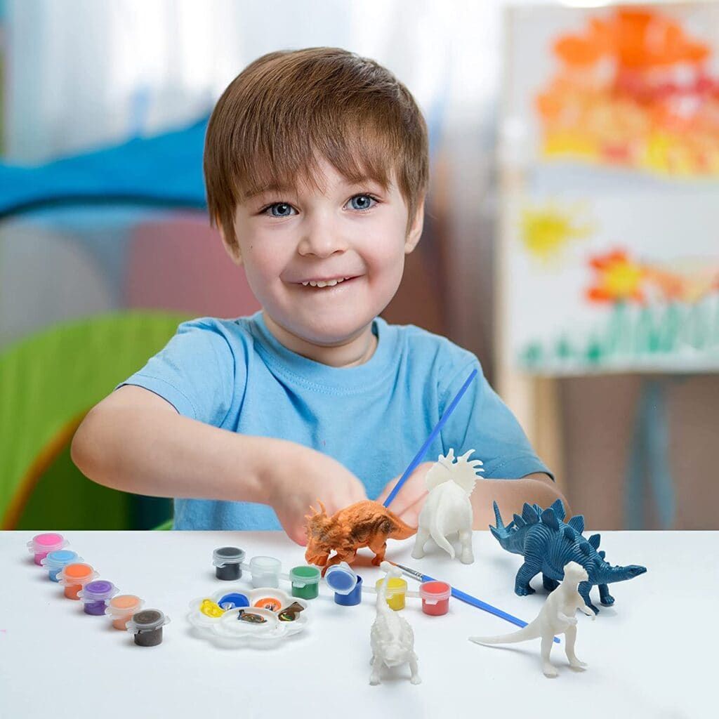 This is a great art and crafts kit for kids interested in dinosaurs. This 13-piece set includes paints, brushes, a ruler, stencils, stickers, etc. The instructions are easy to follow, so they can use the tools themselves or with an adult helper.