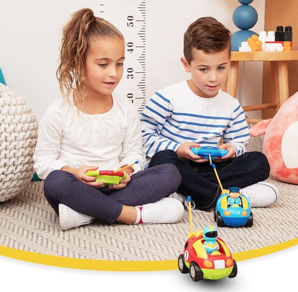 This pack of two cartoon police and race car radio control toys for kids allows two players to race each other. Both cars come with their frequency so that no one has to wait too long before getting another turn. They are compatible with all major brands, making it easy for parents to find the right car for their kids.