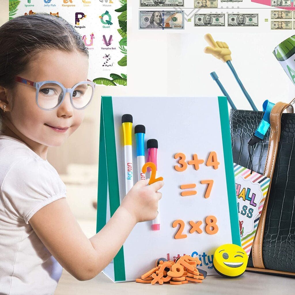 Interactive play learning toys are great for rainy days and gifts. This teacher playset includes a bag, whiteboard markers, and more. It is designed for three-year-olds and up.