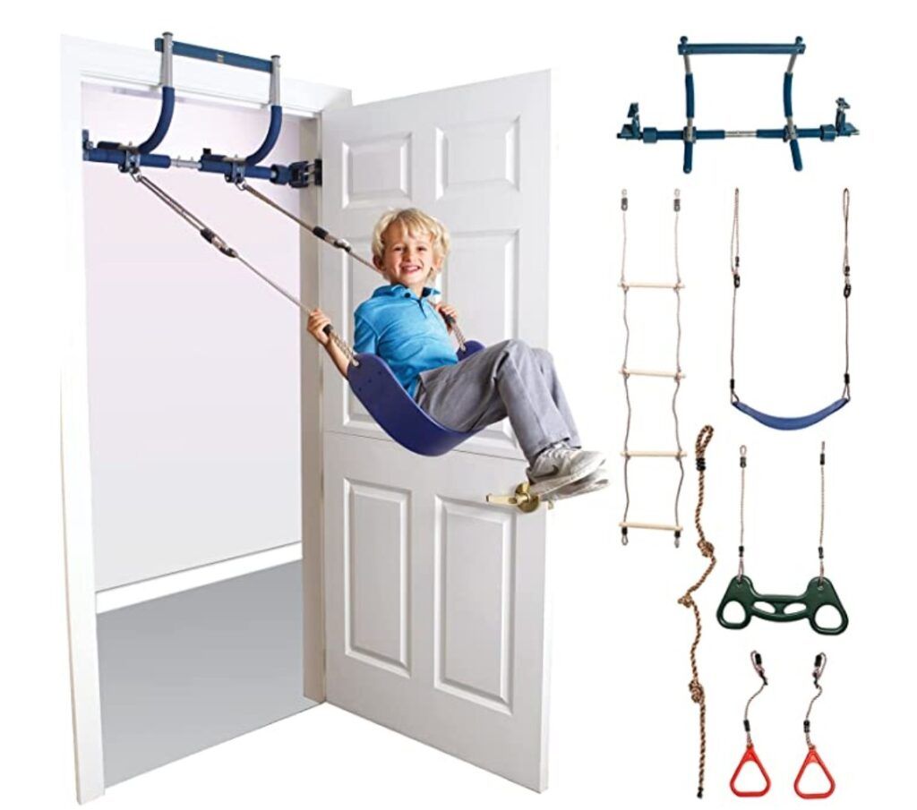 If the weather isn’t great, but you need your children to burn off some energy, this indoor red swing and the core unit works well as an indoor playground! The kit includes six different attachments: a pull-up bar, indoor swing, plastic rings for gymnastics, a trapeze bar, a wood-and-rope ladder, and a knotted rope for swinging or climbing.