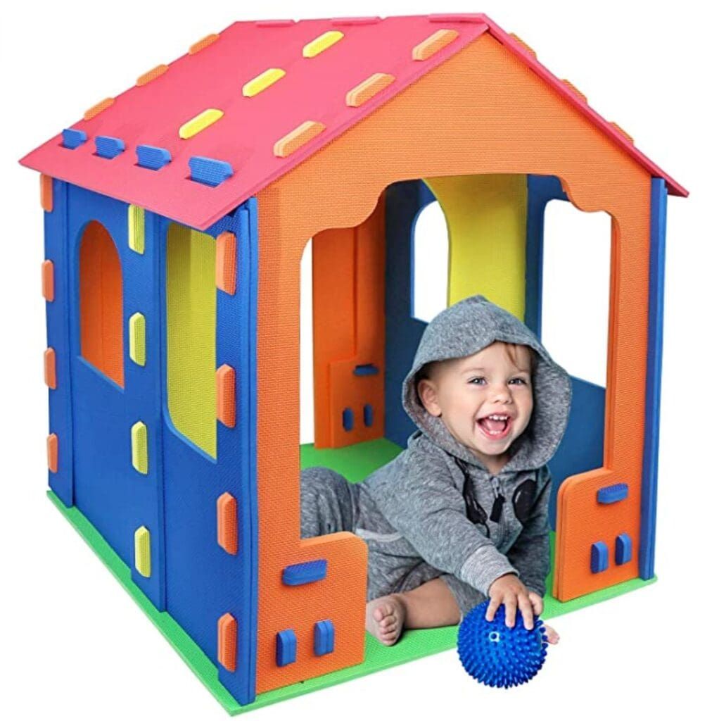 This giant kids foam playhouse will keep little ones entertained for hours and can be used indoors or outdoors. The tent has two doors on either side of the house, so you can quickly get in and out easily. It also comes with six interlocking EVA foam tiles to ensure stability in windy conditions.