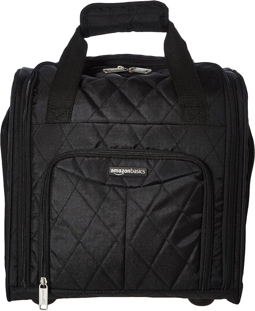 This quilted bag is soft and pliable, giving you the bit of wiggle room you need to stuff your bag handily under the seat in front of you. It rolls, giving you just a bit more flexibility as you make your way through the airport. It’s a great option for a quick weekend trip!
