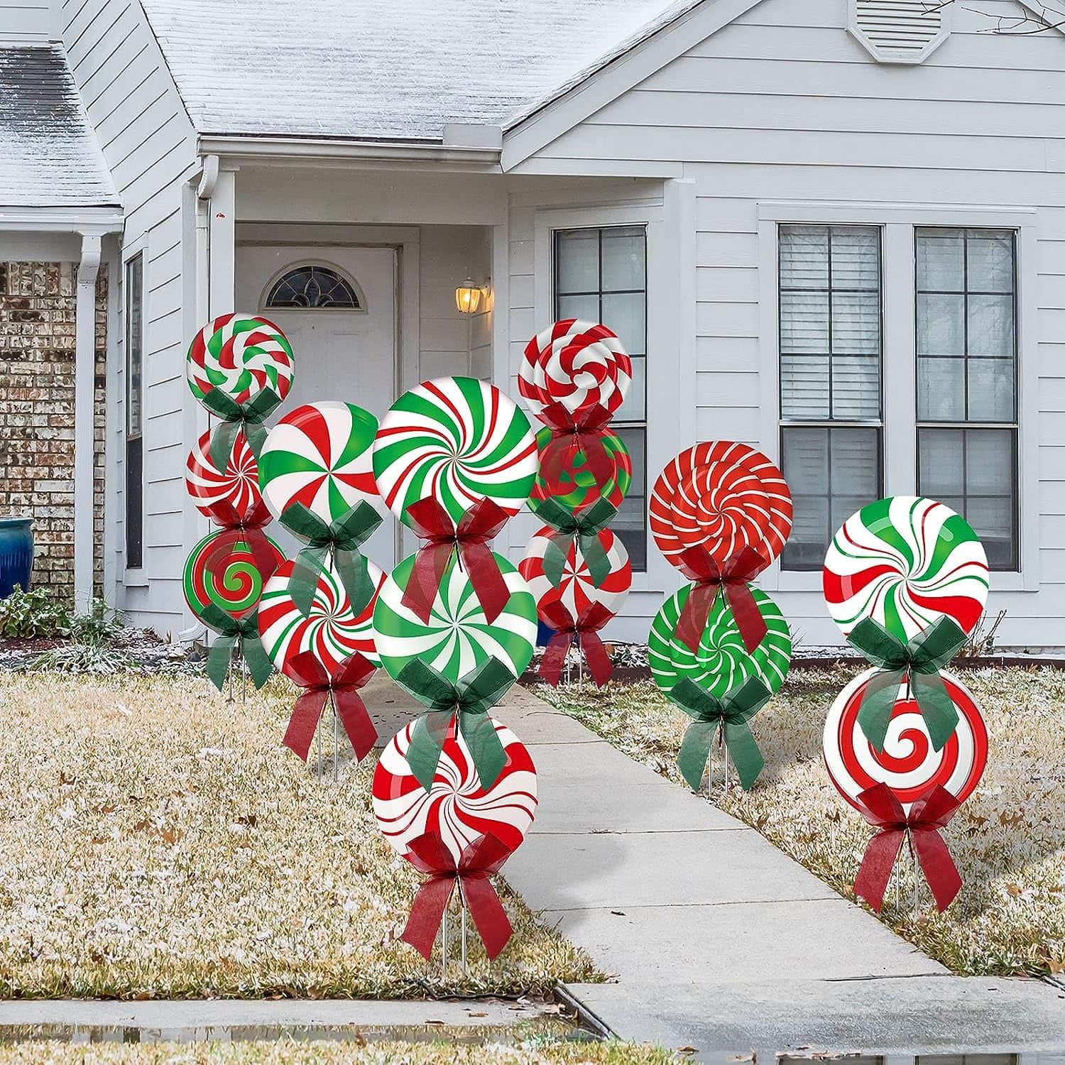 Transform your yard into a candy wonderland with these peppermint candy yard decorations. They’re sweeter than grandma’s secret cookie recipe and bigger than the North Pole. The only thing missing is the “Do Not Lick” sign because they look good enough to eat. Get ready for your neighbors to have a serious sugar craving every time they walk by!