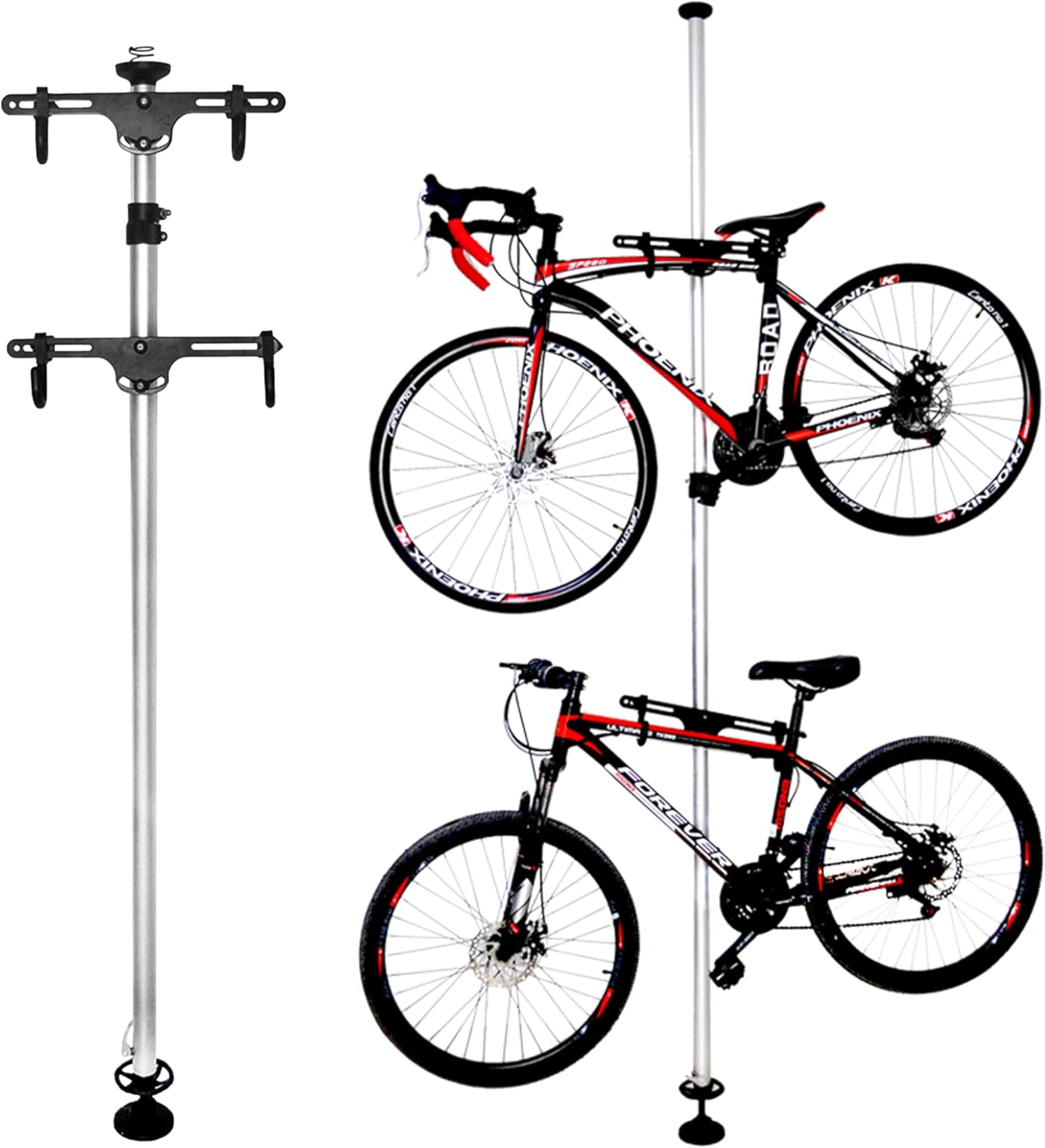 Imagine this: a standing bike rack – as sleek as it is sturdy – that can hold up to two bikes with a gravity-based system. It’s freestanding, adjustable, and there’s no risk of your trusty ridings toppling over.