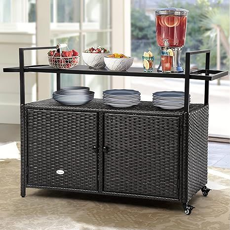 This outdoor wicker bar table is a perfect thing to purchase if you’re looking to elevate and upgrade your patio. Made with a wicker material, so it’s made to last against the elements. Plenty of cabinet space, and bars on the side for storing bar utensils. Plus, it’s built on wheels, so move it where you need it.