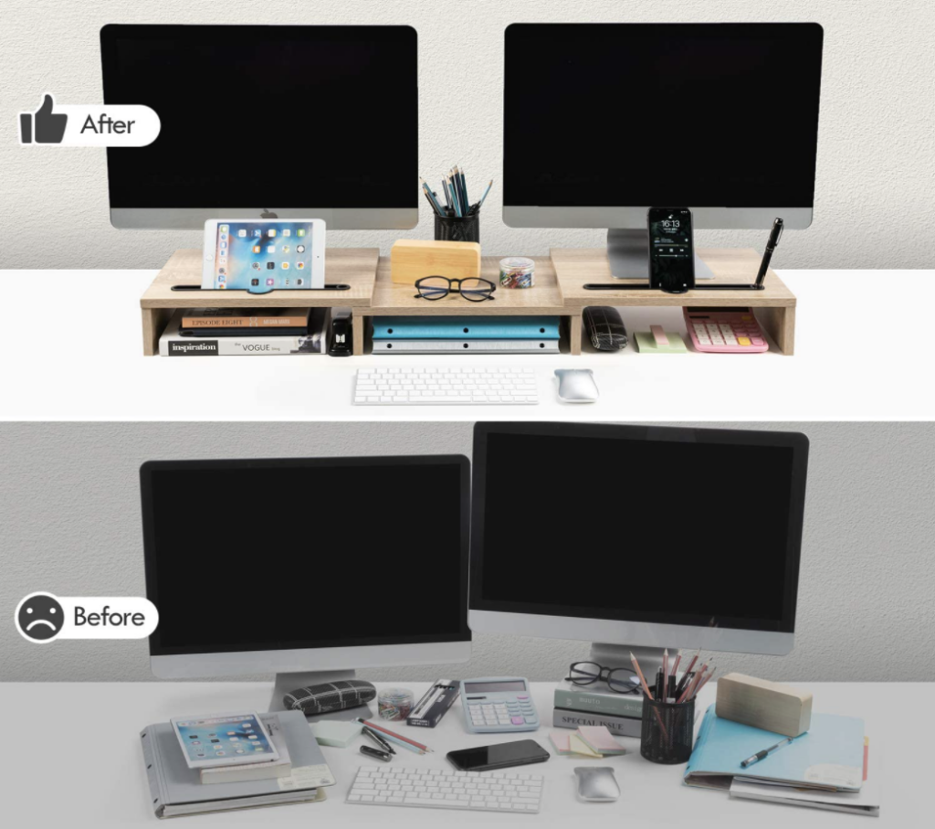 Having multiple monitors is great and I would never go back to single-monitor set-ups if I could help it. However, they can clutter up the space and gather dust rather quickly. Having this monitor riser has been amazing, actually. I love how I can rotate a screen easily without having to do the whole lift and tug and trip over wires dance I used to have to go through.