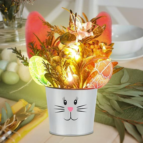 When we think Easter, we think of bunnies and we think of Easter eggs. Get the best of both worlds with this adorable bunny bucket. It comes fully decorated, whiskers and all, with floral branches and leaves, fairy lights, and some lit up colorful Easter eggs.