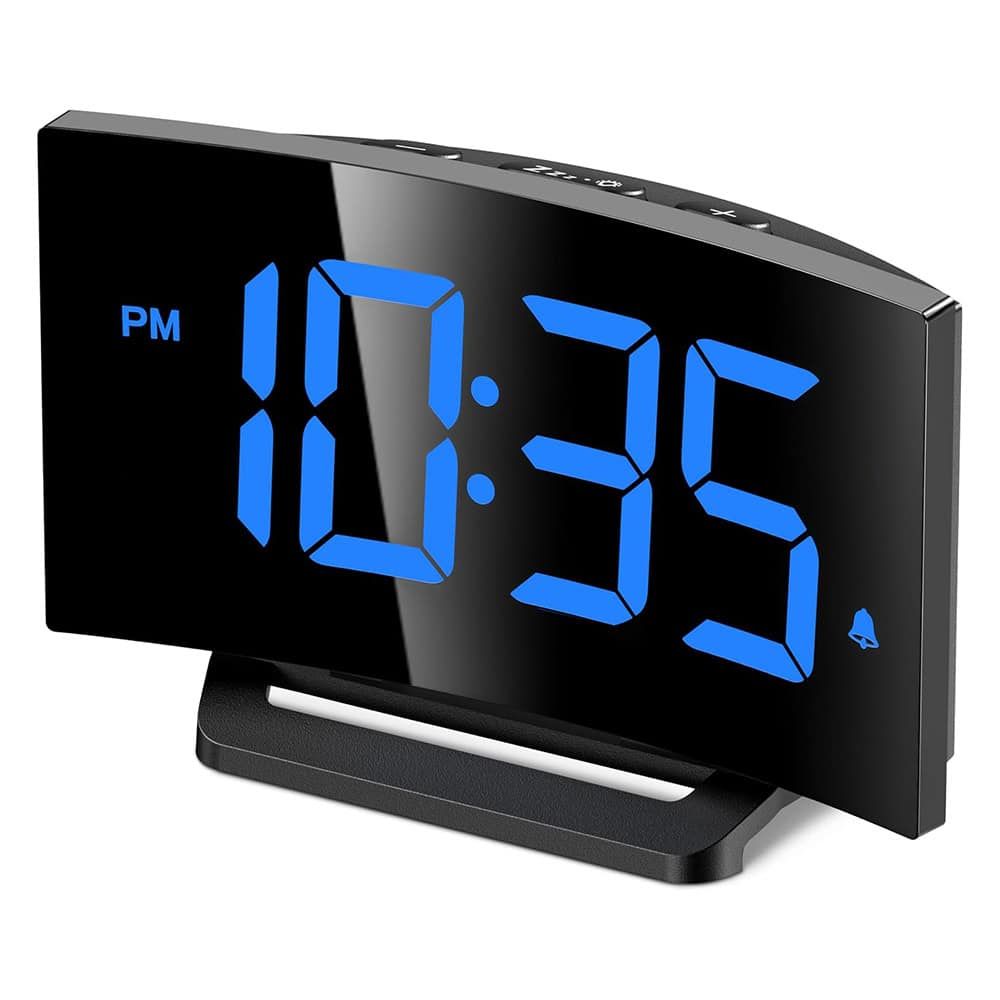 This alarm clock features a large display so you can clearly read the time. The display is dimmable and there’s a nine-minute snooze button if you need a little extra sleep in the morning.
