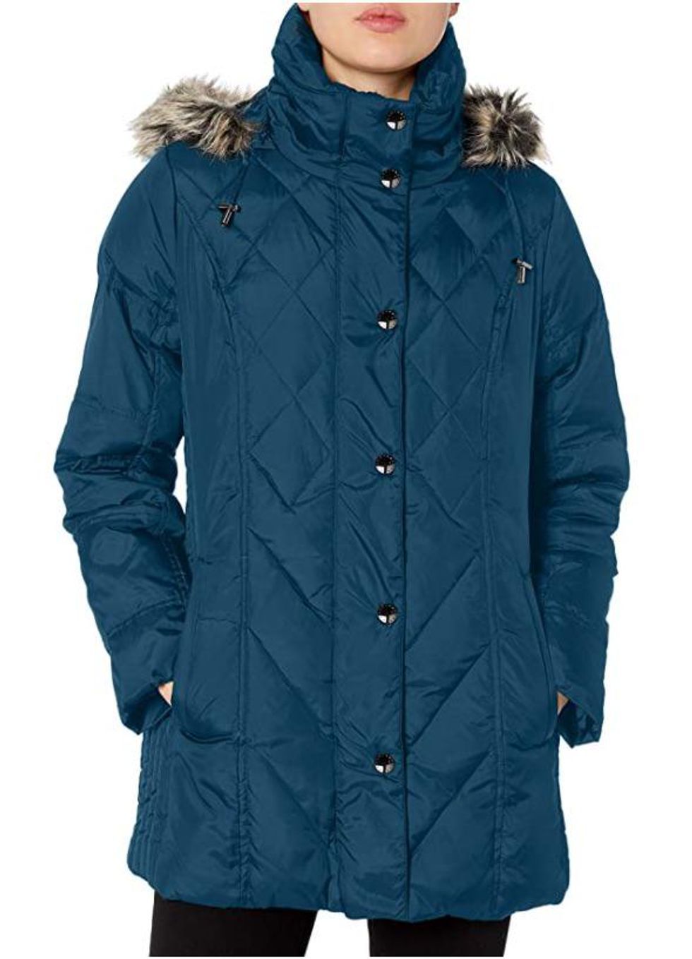 Surprisingly lightweight, the London Fog Diamond Quilted Down Coat manages to avoid bulk while still providing reliable warmth. It features a full zipper and snap placket, along with a detachable drawstring hood with faux fur trim. Some reviewers report that it runs large, which might suit you fine if you plan to wear bulky sweaters underneath. If not, consider sizing down.
