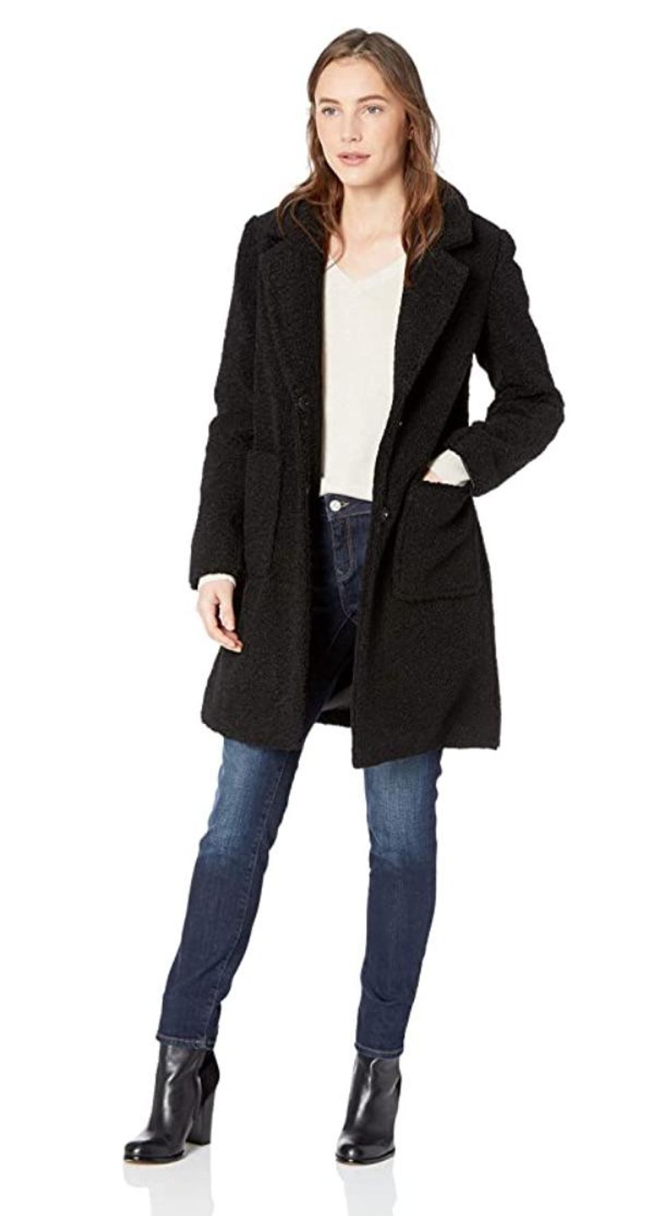 If you want a new coat with a lot of style, this is a fabulous choice. This French Connection Faux Shearling Coat has a fresh, on-trend style that looks best slightly oversized. It’s designed with straight lines and simple snap closures. There’s a tremendous amount of love for this coat in the Amazon reviews; the most common comment is that it earns the owners a lot of compliments.