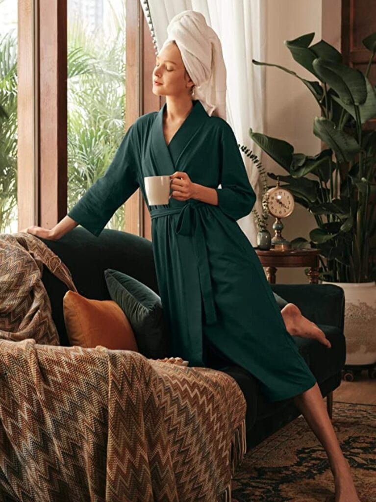 Lounge around in this comfortable cotton bathrobe after a much-needed spa day from home. This soft cotton kimono is available in all sizes and comes in 11 different colors. This lightweight robe is highly breathable and ultra-absorbent. It is also machine washable.