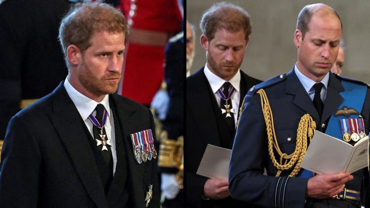 Harry sported non-military attire as he joined William and King Charles, for the procession as the coffin made its way from Buckingham Palace to Westminster Hall, where it will stay until the Queen’s funeral on Monday.