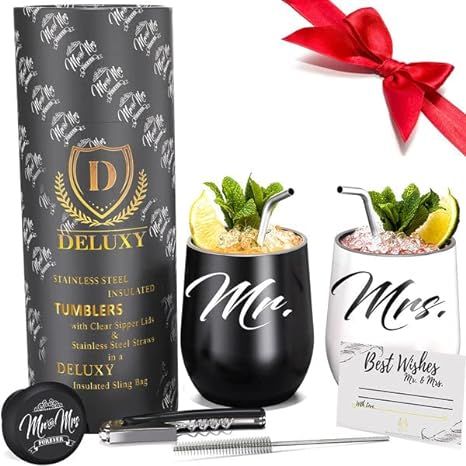 This adorable wine tumbler set is engraved with a traditional Mr. and Mrs. emblem. Protected with material to manage your temperature needs keeping cold wine cold, and room temp wine the temp it needs without warming it in your hand. This would make for a good gift set for an anniversary or wedding.