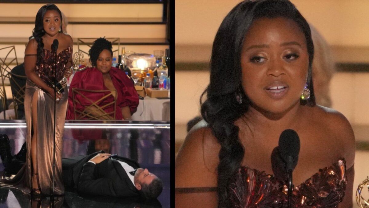 During Quinta Brunson’s speech at the Emmy Awards, Jimmy Kimmel was seen lying down on the floor beside her, and people have since called him out for his actions.