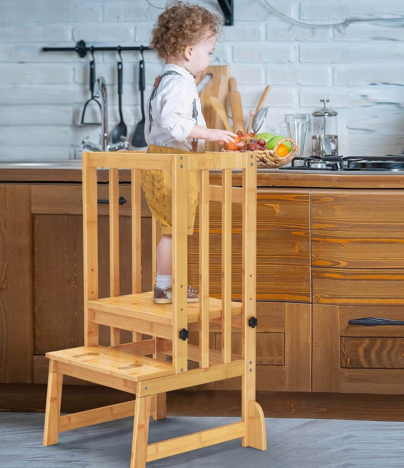 Little ones love to help in the kitchen but can be more liability than the sous chef. This toddler step stool tower has a 200-pound weight capacity and a “fenced-in” design that keeps kids right where you want them. Adjust it to three different heights as your kiddo grows. This is equipped with vertical safety rails and anti-slip grippers on the bottom.
