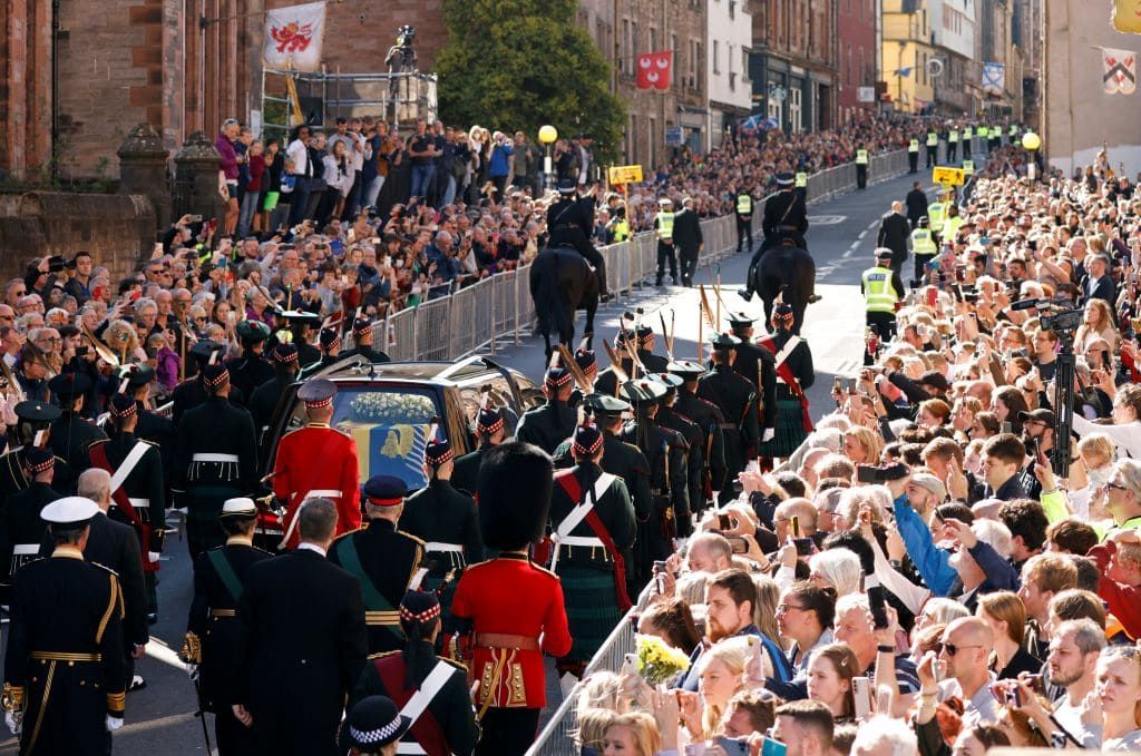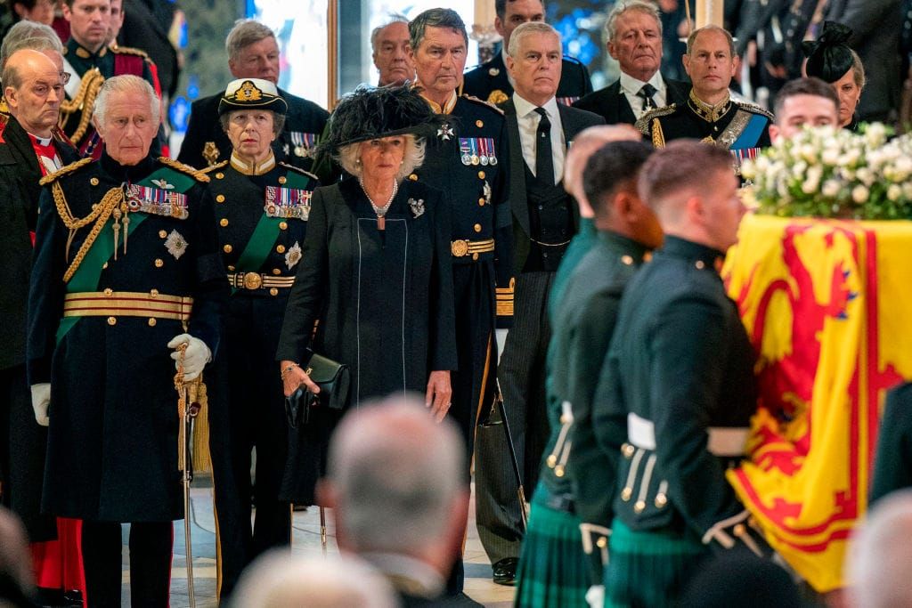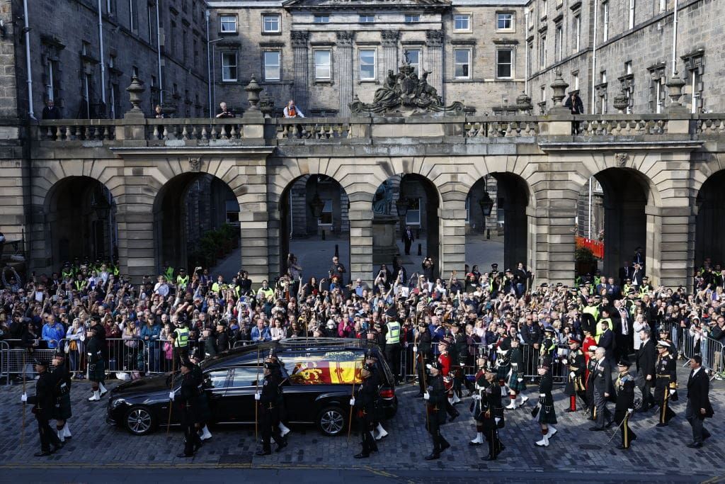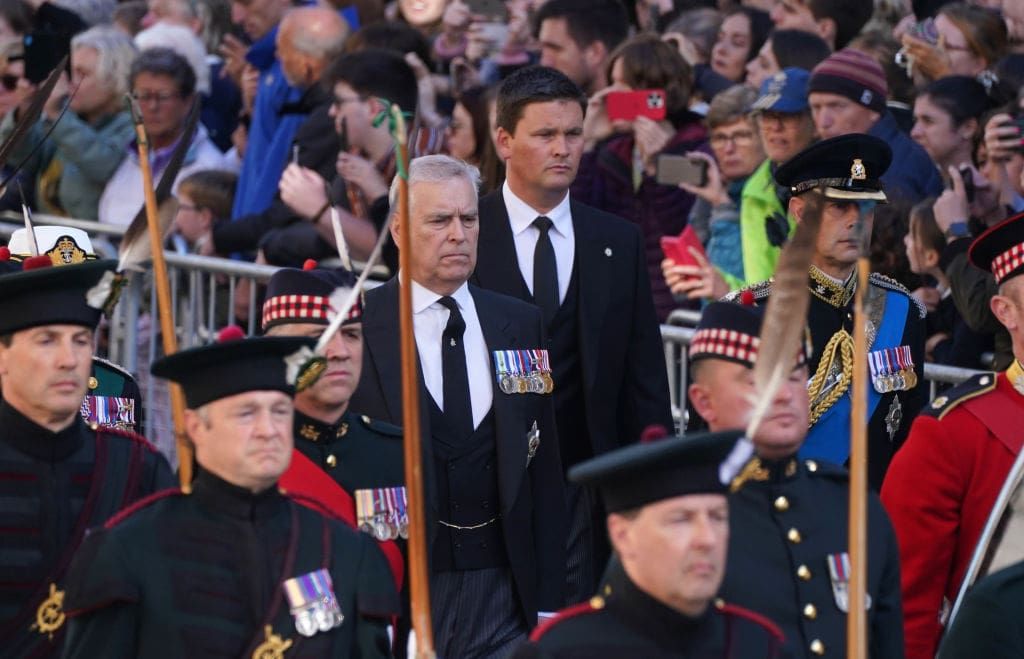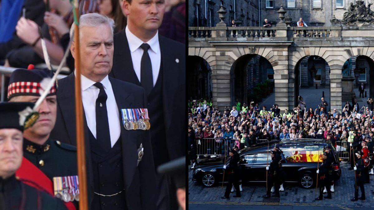 Prince Andrew was heckled in Edinburgh as he followed behind his mother’s coffin today, which was driven through the streets of Scotland.