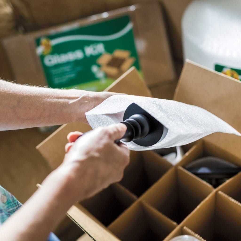 Sometimes, paper is better. While I love bubble wrap, paper is burnable, so you can always save your packing paper to burn in your winter fires. This paper is a great way to keep your breakables safely tucked away with little effort and no bubble wrap involved.