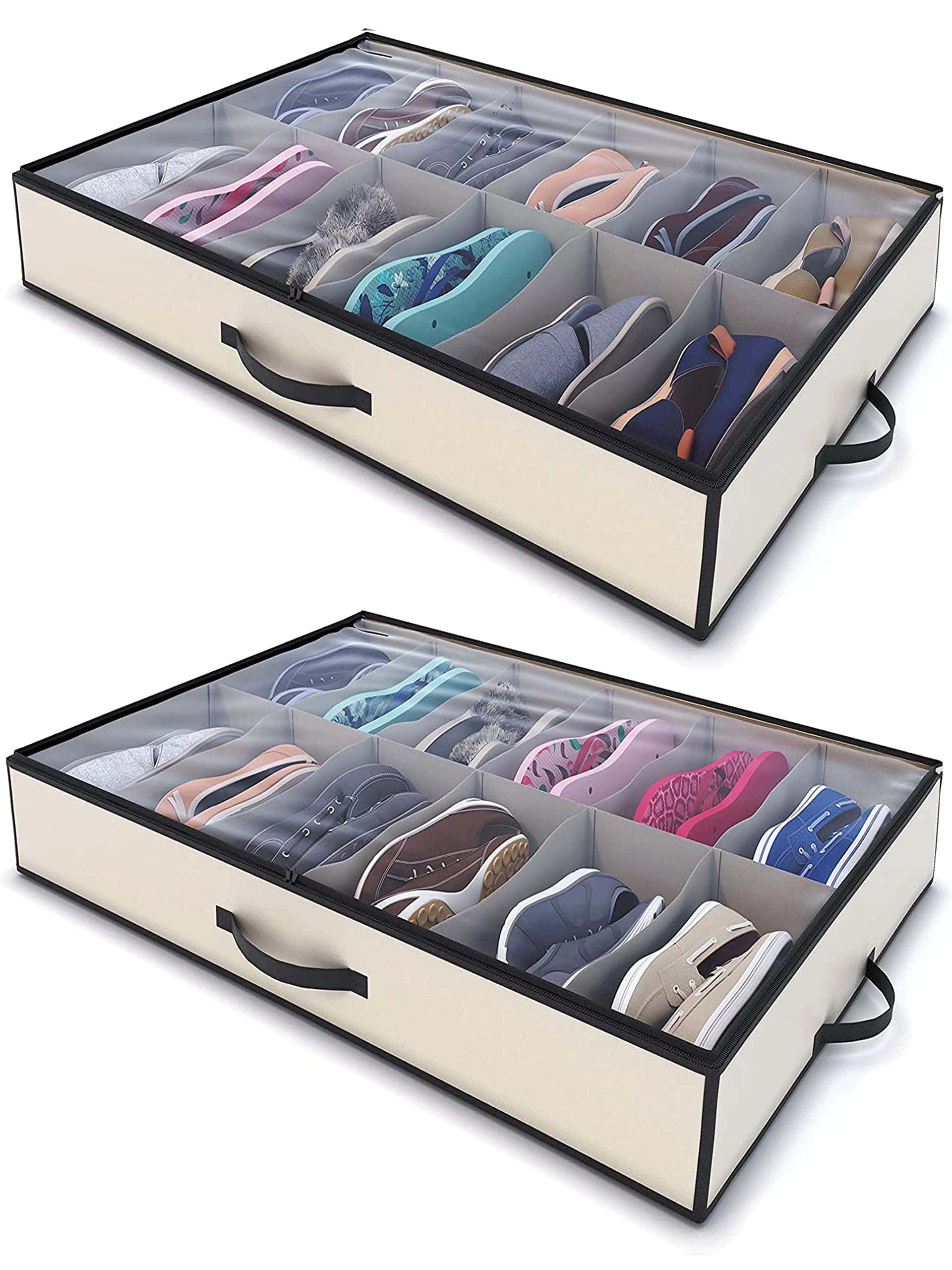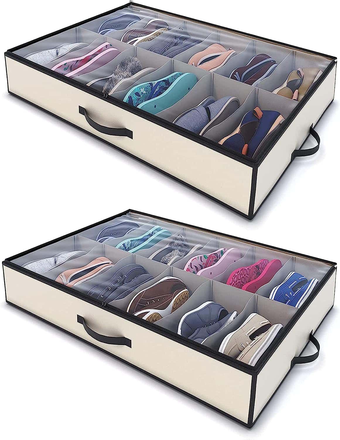 - Superb Space Saver: This set comes with two large containers, each capable of tucking away 12 pairs of shoes neatly under your bed.