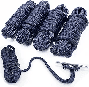 Boaters seeking reliable mooring lines will appreciate the Marine-Grade Dock Lines for Boats Up to 30ft – 4 Pack. These lines are noteworthy for their robust double-braided nylon construction, tailored to withstand challenging marine environments, including resistance to UV rays, abrasive saltwater, oil, and gasoline exposure. Each line includes a conveniently pre-sliced eyelet, simplifying attachment to docks or posts. The stresses typical of docking maneuvers are well-managed through the shock absorption properties, mitigating potential damages to your craft. These characteristics make these dock lines a preferred choice for recreational boaters who value performance and durability.