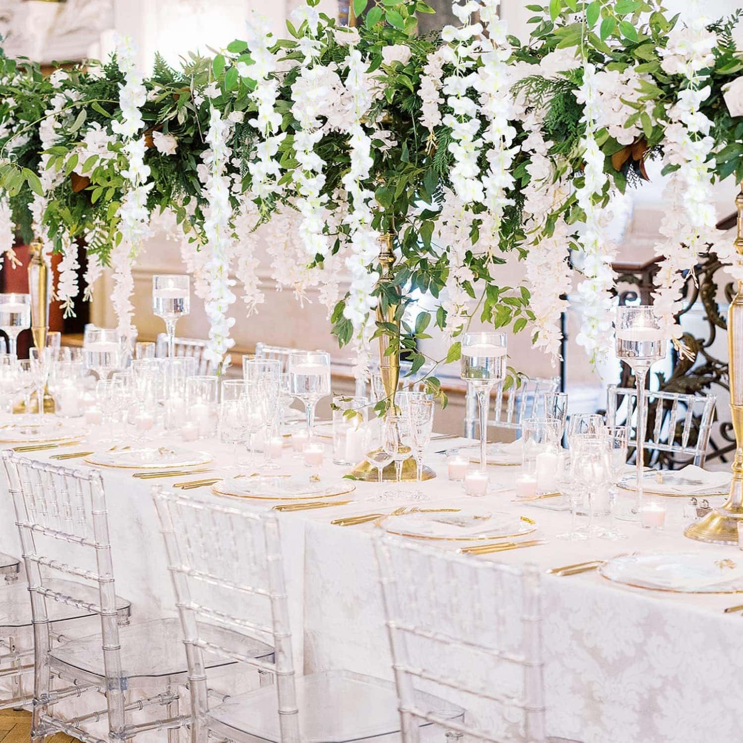 Step into wedded bliss with Metal Floral Hoop Centerpieces, where circles of gold elevate your table setting to Olympian heights. DIY tip: Blend the artificial with the real in your floral arrangements for a display that sings, “Forever and always” in the key of blooms, charming every guest at sight.