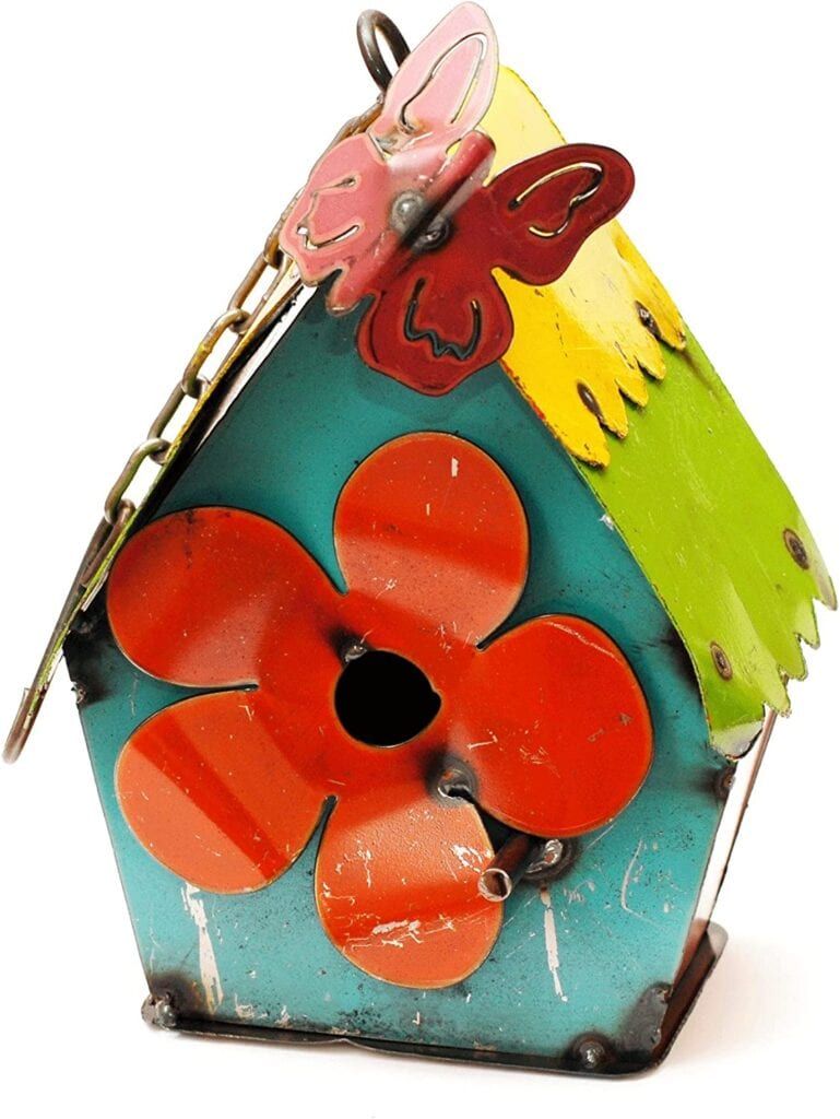 Reviews say, “This was just what I was looking for. This birdhouse is made of spot-welded sheet metal and is very colorful and sturdy. It looks perfect in my poolside landscape! Great bargain!”