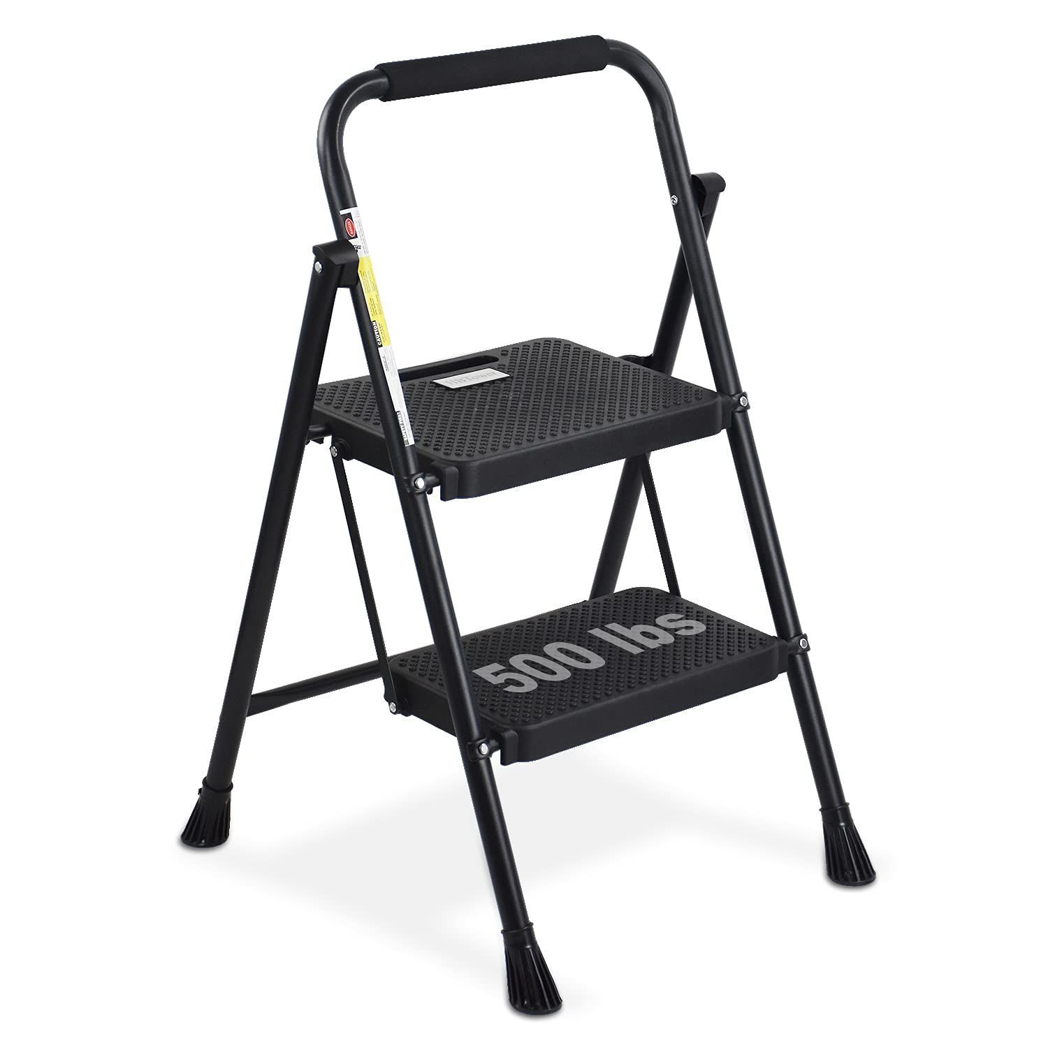 The HBTower Folding 2 Step Ladder has a weight capacity of up to 500 pounds. It is designed to be sturdy and reliable, providing support for various tasks around the house.