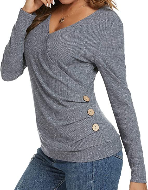 If you want more coverage in your midsection, this casual wrap top is calling your name. I know a lot of women with a similar complaint and finding something that’s comfortable without looking dumpy is a challenge. This top features three wood buttons on the side, loose sleeves, and a length that just covers the hips that you won’t be tugging on all day.