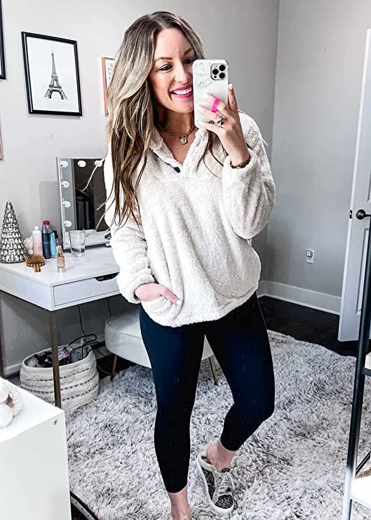 Think ahead with me, if you will, to a time in the not-so-distant future where you can see your breath when you go outside and you’re buying hot coffees at Starbucks instead of cold brew. This fuzzy fleece hoodie delivers on warmth, comfort, and style where regular sweatshirts and hoodies cannot, thanks to its trendy button neckline, ribbed cuffs and hem, side pockets, and functional hood.