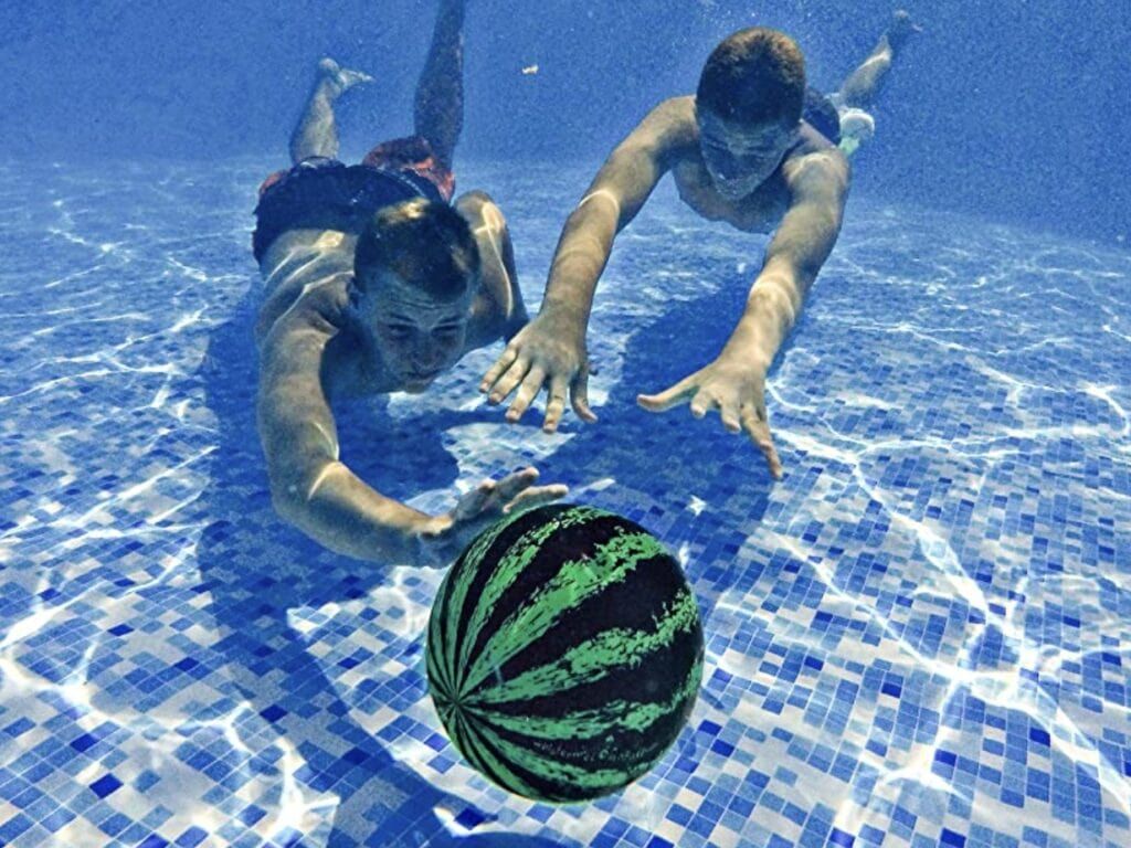 For a unique game to play in the pool, use this watermelon ball. You can dribble it, kick it, bounce it, and pass it around 10 feet underwater due to its natural buoyancy. It fills with water and mimics a true watermelon when placed in water, so you’ll be able to play a wide variety of games.
