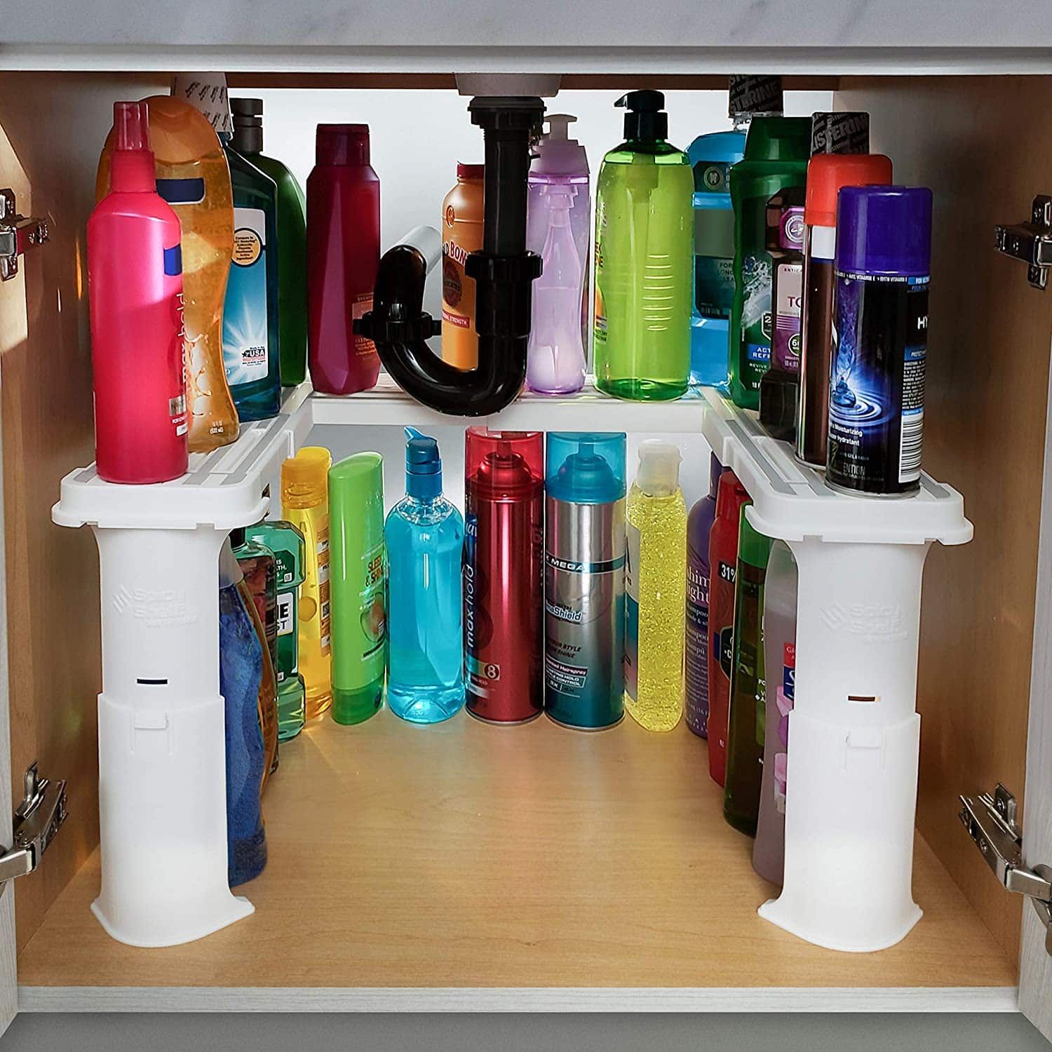 Under sink storage is usually an underutilized space and an unorganized mess. (That includes me; don’t look under my bathroom sink please.) This shelf organizer has expandable depth, height, and width for the ultimate flexibility to give you two levels of storage that also takes your plumbing into account. The top shelf in this set can hold a whopping 40 pounds whether you’re using it in the kitchen, bathroom, laundry room, or somewhere else.