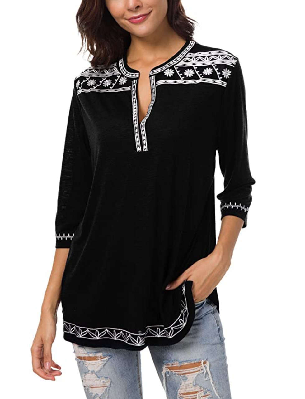 There’s no need to worry about whether or not this tunic will fit you after a few washes — the relaxed fit will look great no matter how many times it goes through the dryer. It features adorable embroidered details, while the split neckline is modest enough for any occasion.