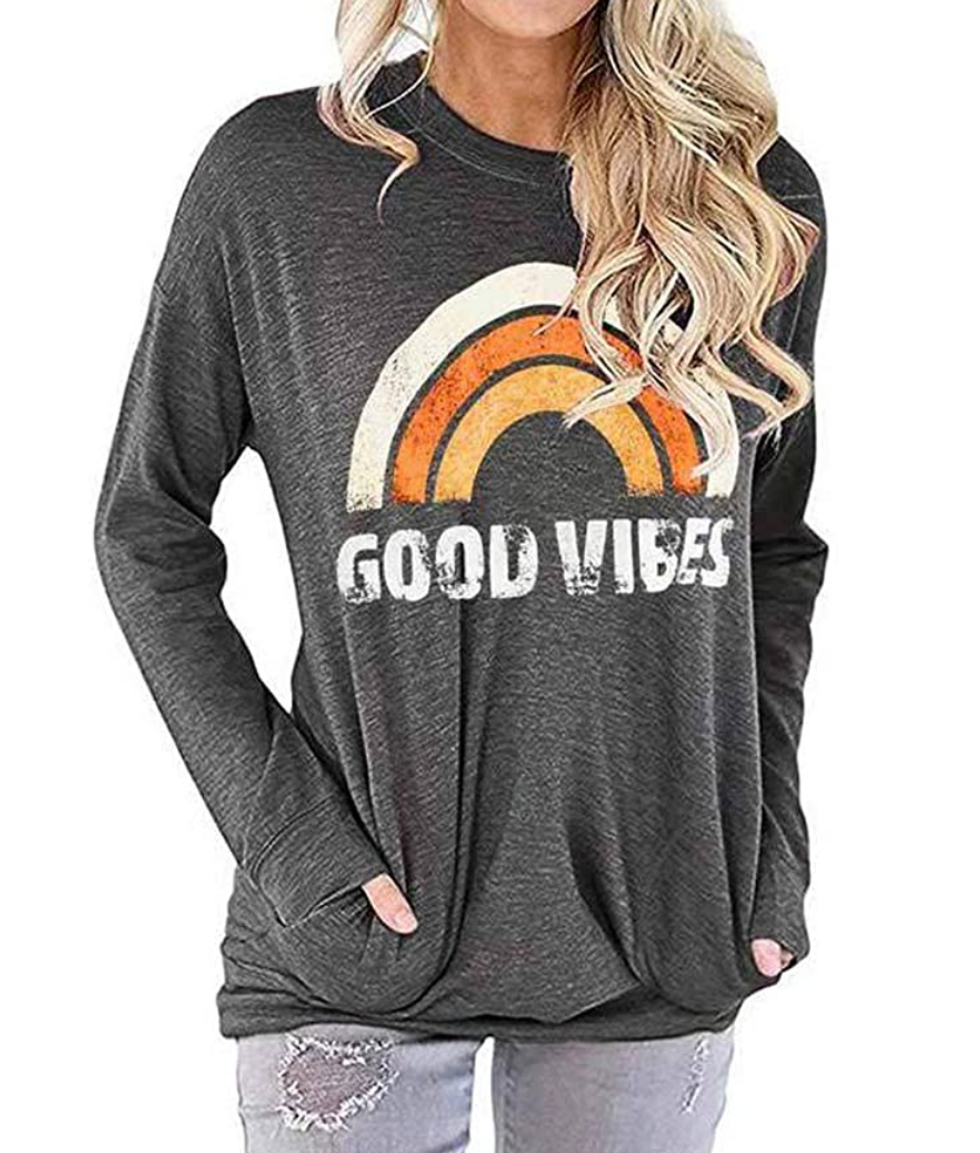 Instead, I’m putting on cozy joggers, cotton T-shirts, and cute hoodies — with the occasional dressy blouse during an important Zoom meeting, of course. But there’s an art to dressing comfy-casual — you can’t just throw on anything, or else you’ll risk looking sloppy. So keep scrolling to see some of my favorite (and fashionable) clothes that I like to work from home in. If I had to pick just one thing, make sure to keep an eye out for chic blouse with balloon sleeves, as well as the “Good Vibes” T-shirt. You can’t go wrong with either.