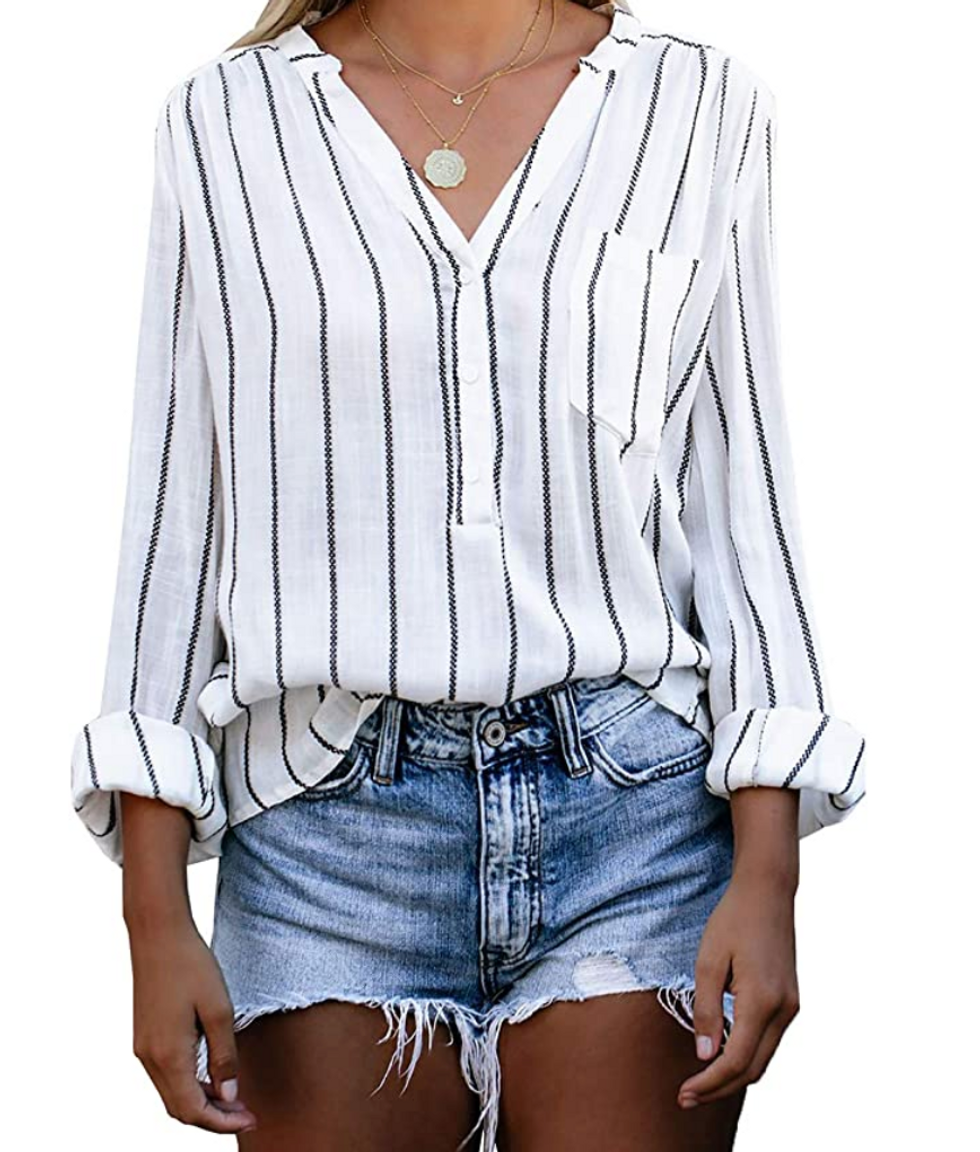Who cares if you aren’t wearing pants? This top is so professional that everybody will be distracted by the upper-half of your body — but I still recommend wearing at least sweats on the bottom. The cuffed three-quarter sleeves give it a breezy feel, while the relaxed fit keeps you comfortable all day long. Grab it in 10 different colors, all fitting true-to-size.