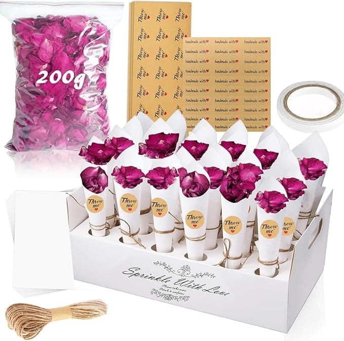 The petal toss is the one traditional moment that photographs beautifully every single time. This set gives you 30 cones for £15, filled with dried rose petals.