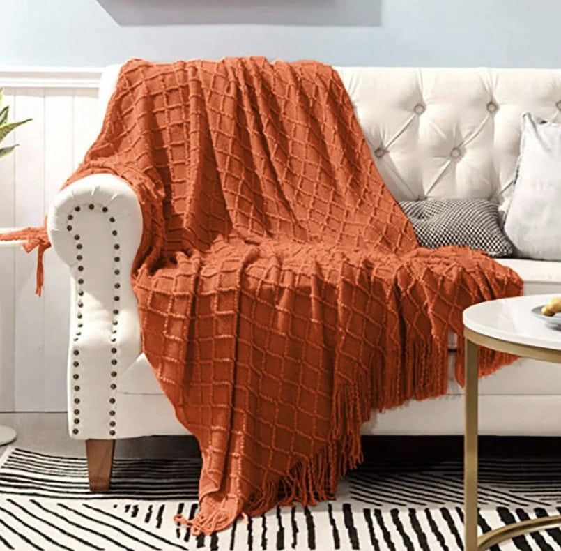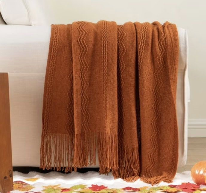 Wrap yourself in cozy autumn vibes with this soft, burnt orange throw blanket. Perfect for chilly evenings, it adds a warm splash of color and texture to your sofa or bed. With elegant fringe details and a generous size, this beautiful blanket turns any room into a comfy, inviting spot ready for pumpkin spice season.