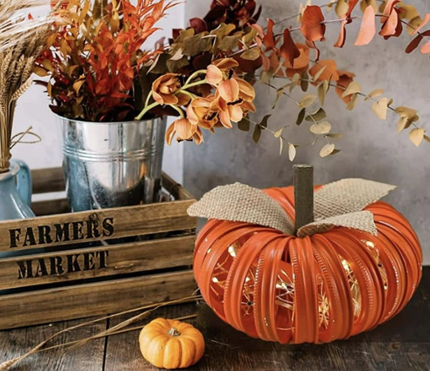 Elevate your fall décor with this handmade mason jar lid pumpkin that lights up your space with 30 tiny LED bulbs. Its bright orange hue and soft glow make it a standout centerpiece or shelf accent. Battery-operated for easy placement anywhere, it’s perfect for creating a cozy, seasonal atmosphere in kitchens, living rooms, or porches. A charming and versatile addition to your autumn decorations.