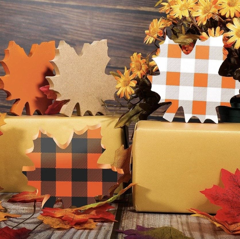 Celebrate the beauty of fall with this set of wooden maple leaf decorations. Each piece features vibrant autumn colors and classic plaid patterns, perfectly capturing the spirit of the season. Sized just right to fit on tables, shelves, or tiered trays, these durable wooden leaves bring warmth and festive charm to any space. Their solid construction means you’ll enjoy this timeless fall decor year after year.