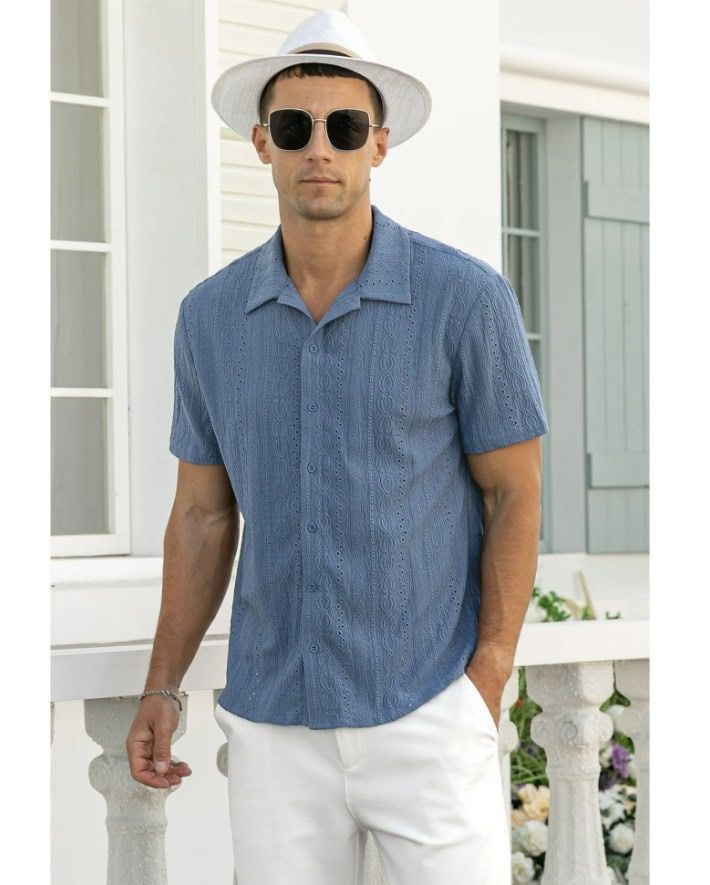 He may be broke, but he’s not about to wear a graphic tee from 2009. This mesh button-down is that “I vacation in places I can’t afford” energy. It’s crisp, cool, and ready to distract everyone from the fact that he hasn’t updated his résumé since the Obama administration.