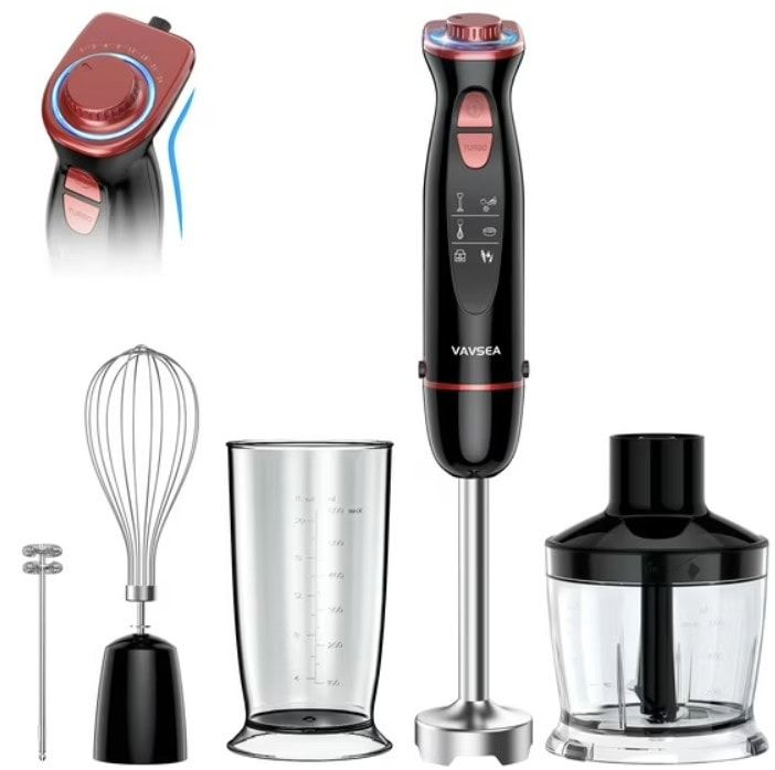 Forget the kitchen chaos—this 5-in-1 immersion blender powers through everything from smoothies to baby food with 24 speeds and turbo mode. Its stainless steel blades slice, chop, whisk, and froth like a pro. Plus, cleaning’s a breeze with detachable parts. This deal blends serious power with serious value—grab it before it’s gone!