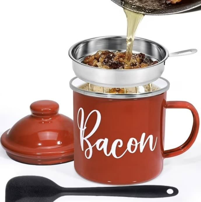 This bacon grease container turns kitchen scraps into flavor gold. It filters, stores, and protects up to 46oz of oil, grease, or lard—no spills, no smells, no mess. The stainless steel strainer keeps bits out, while the enamel body and silicone spatula keep things smooth. Whether you’re frying eggs or seasoning a cast iron, this little tool makes every spoonful of leftover fat worth its weight in yum.
